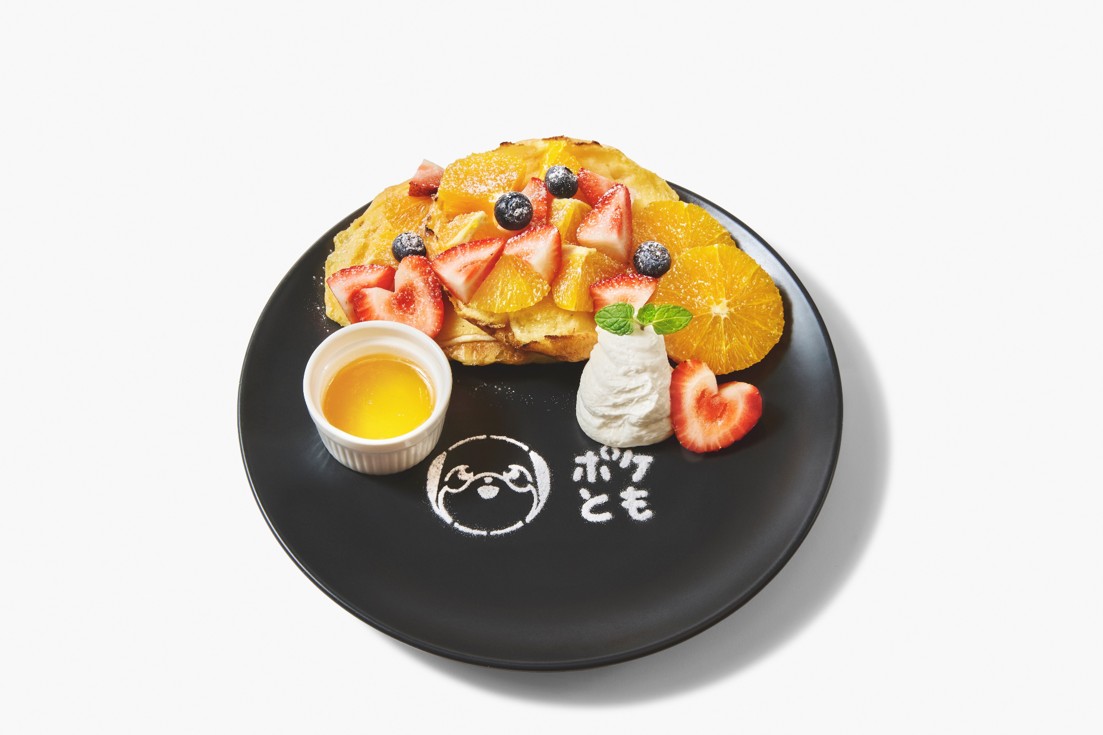 ハンバーガーのパンで作ったフレンチトーストに、ポケとものボタンをイメージしたオレンジやイチゴ、ブルーベリーをたくさん乗せた特製フレンチトースト。